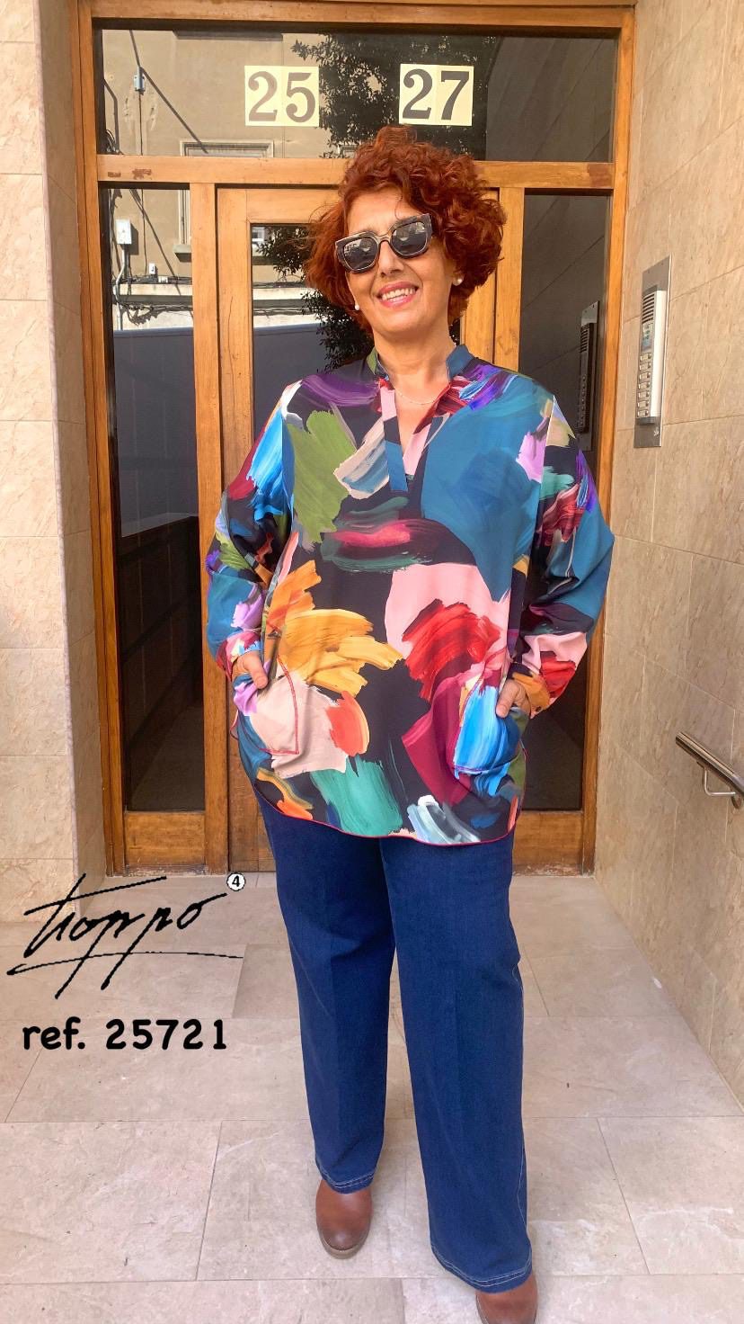 Blusa estampada larga con cuello mao y escote pico. Manga larga y bolsillos laterales.