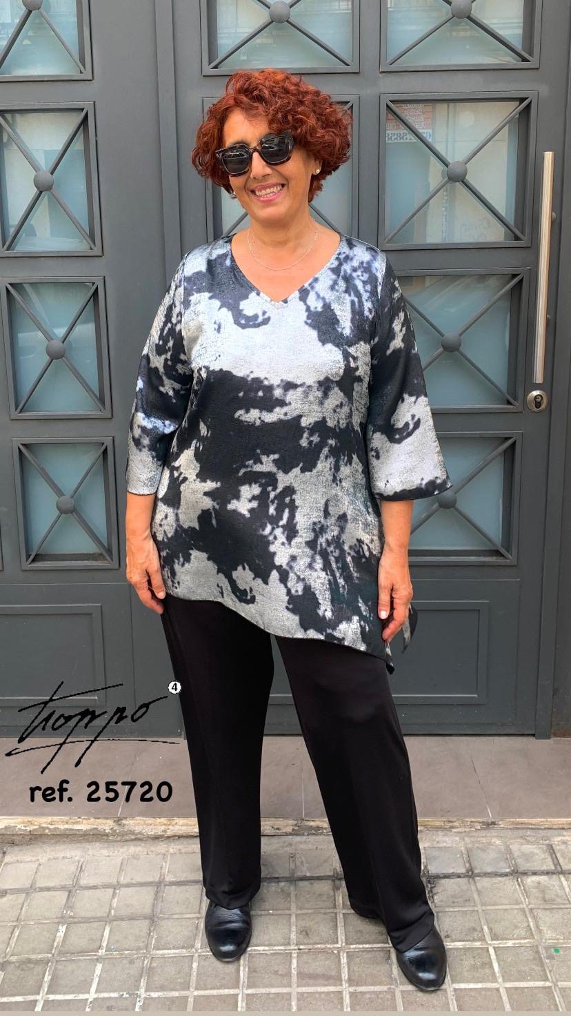 Casaca estampada con cuello pico, mangas al codo y bajo desigual con acabado en pico. Aberturas laterales.