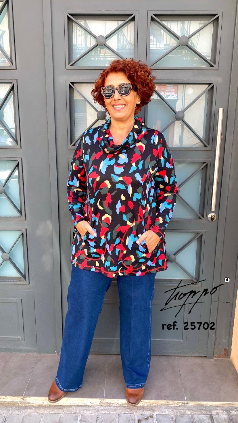 Jersey fino, estampado largo con manga larga y cuello vuelto caído. manga larga y aberturas laterales. Bolsillos laterales.