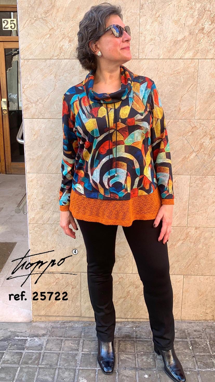 Jersey estampado abstracto, combinado con faldón y puños a juego, color negro, lisos. Manga larga y cuello vuelto caído con cordón decorativo.