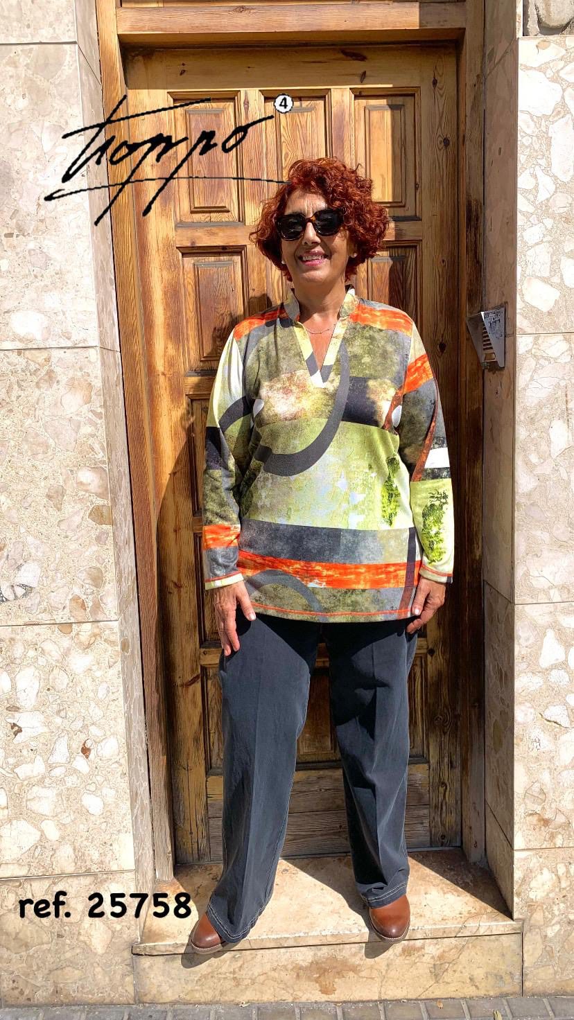Jersey fino estampado, con cuello mao y escote pico. Manga larga.