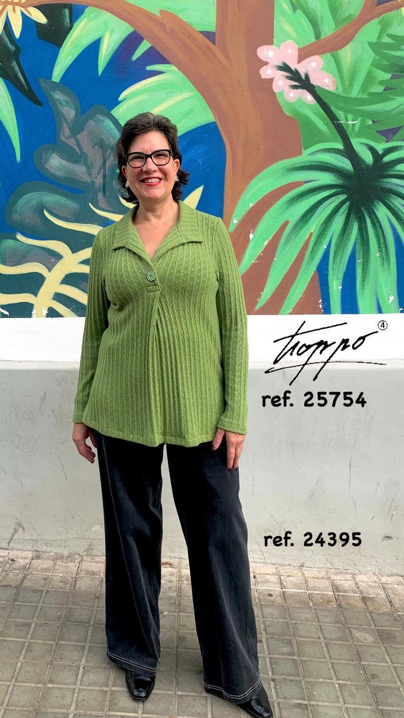 Jersey liso con dibujo de trenzas. Manga larga, cuello solapa con escote acabado en pico. Botón decorativo y pliegue en delantero.