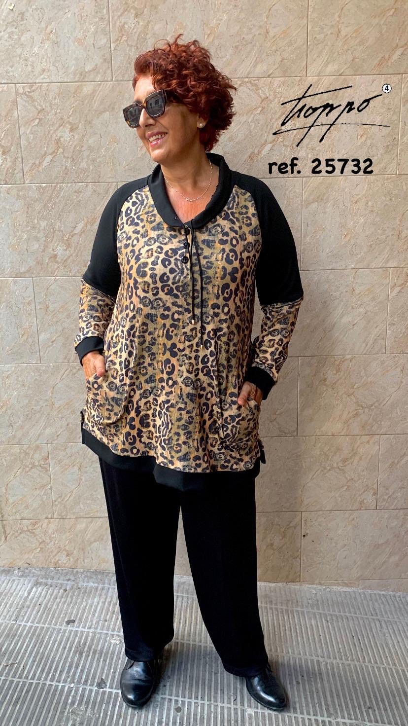 Sudadera estampada de animal print y combinada con liso en negro. Liso en canesú, cuello puños y bajo. Cuello camisero y escote redondo, con cordón y botones a juego.